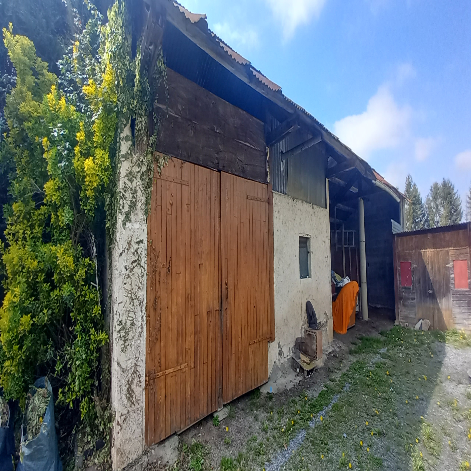 Appentis de 48 m2, grange de 17,04 m2 et garage de 15,45 m2 avec toit en tôle en bon état.