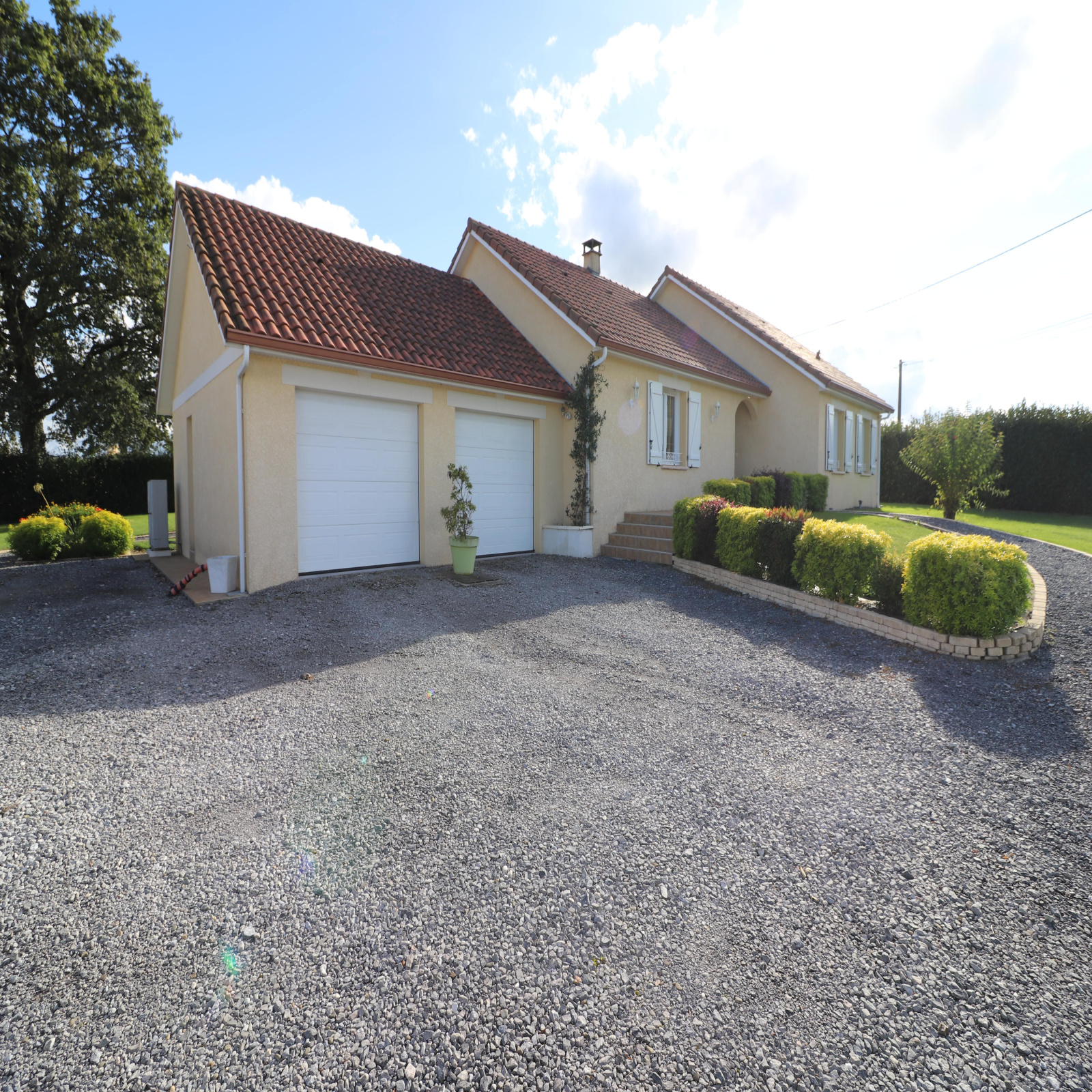Double garage avec portes motorisées, attenant et communiquant à la maison.