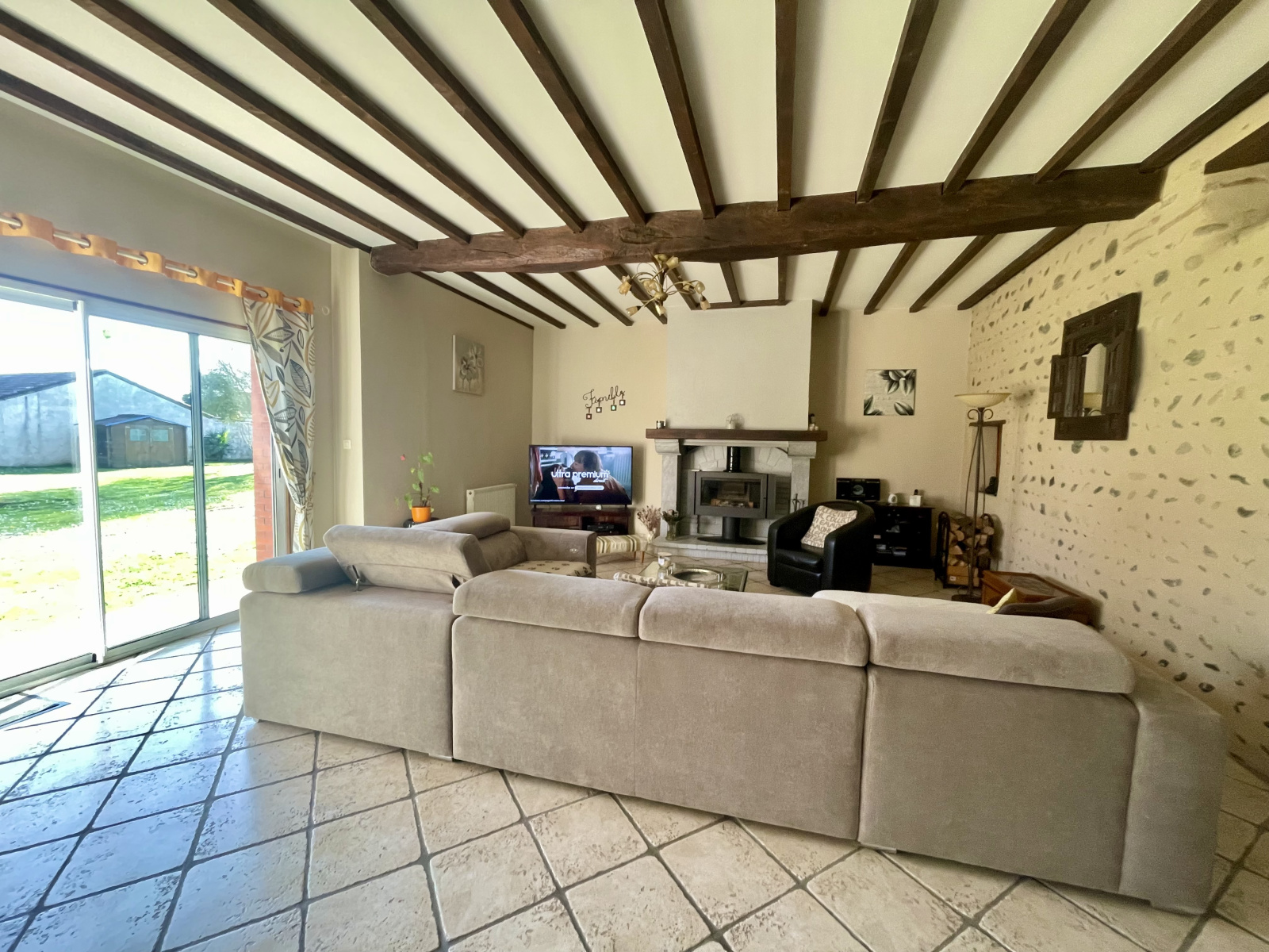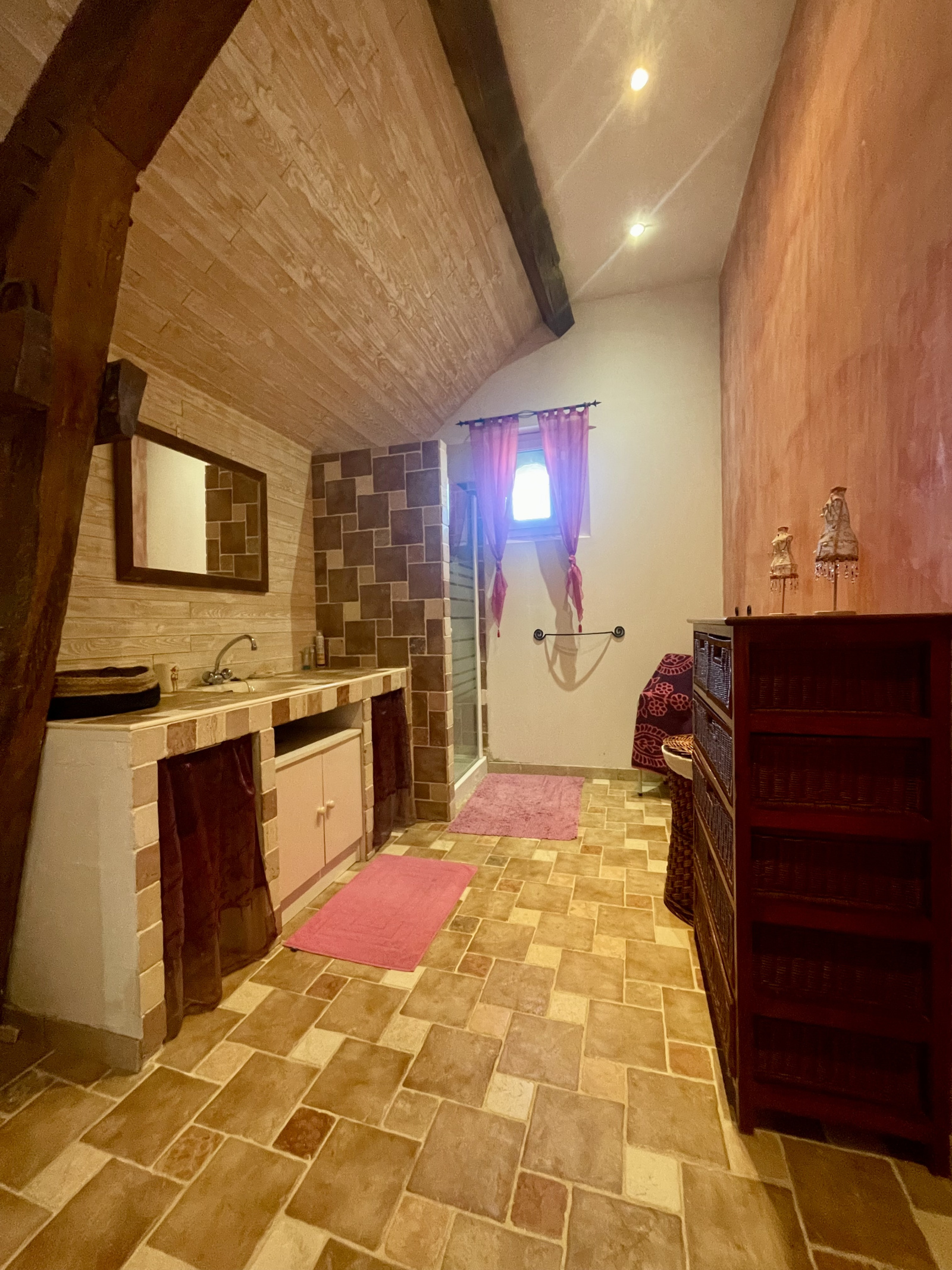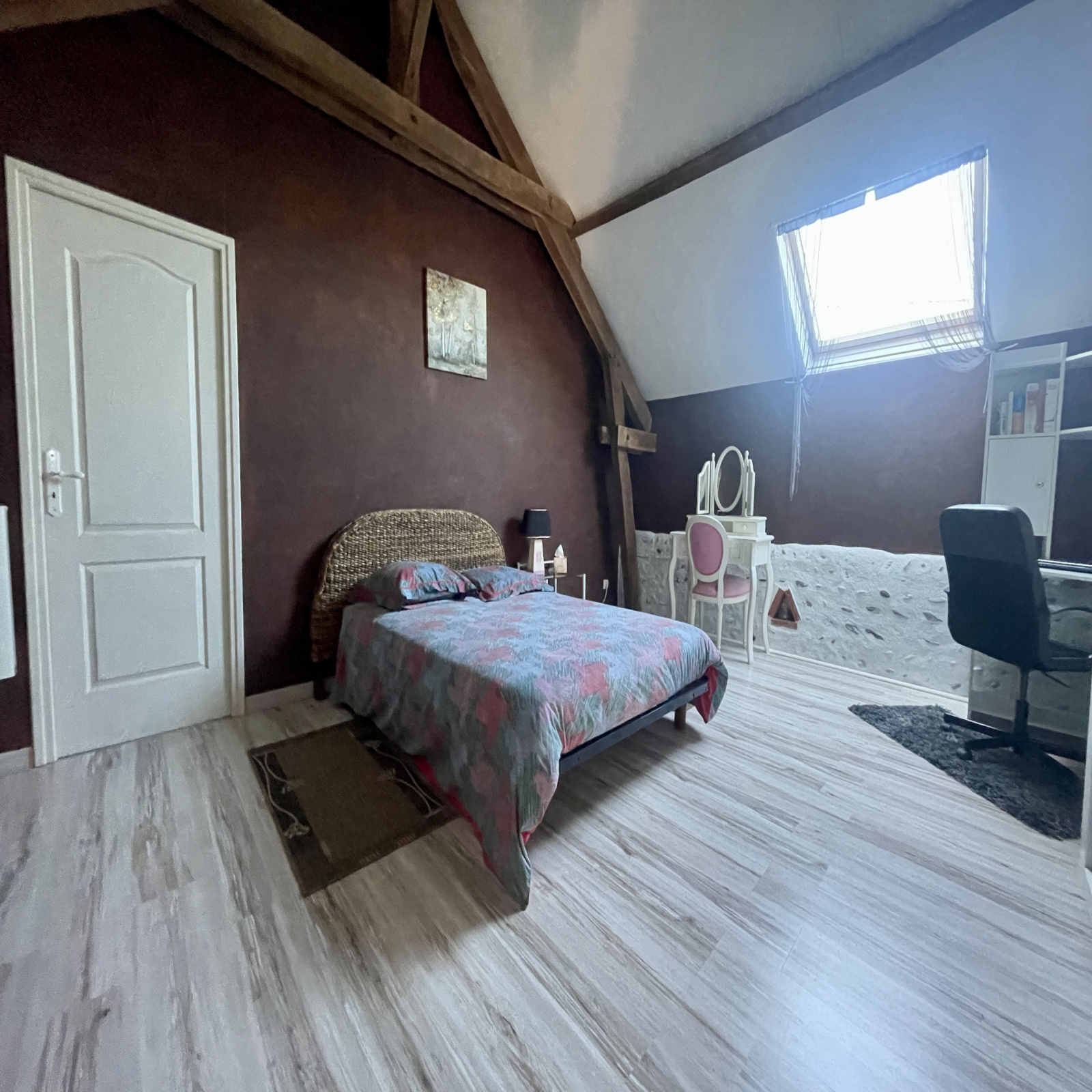 Aucun travaux à prévoir. Maison avec beaucoup de cachet grâce aux poutres apparentes, murs en galets et un bel escalier en bois.