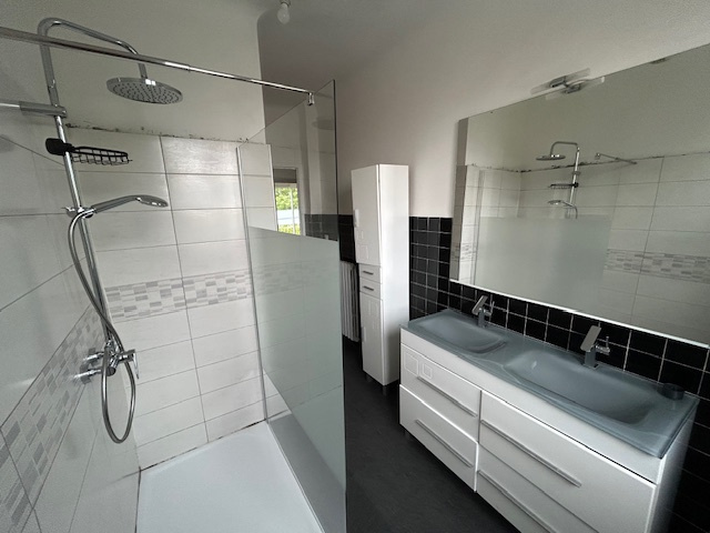 Au rez-de-chaussée, on trouve un appartement T3 de 66 m2, avec salon séjour, cuisine aménagée, deux chambres et une salle d'eau.