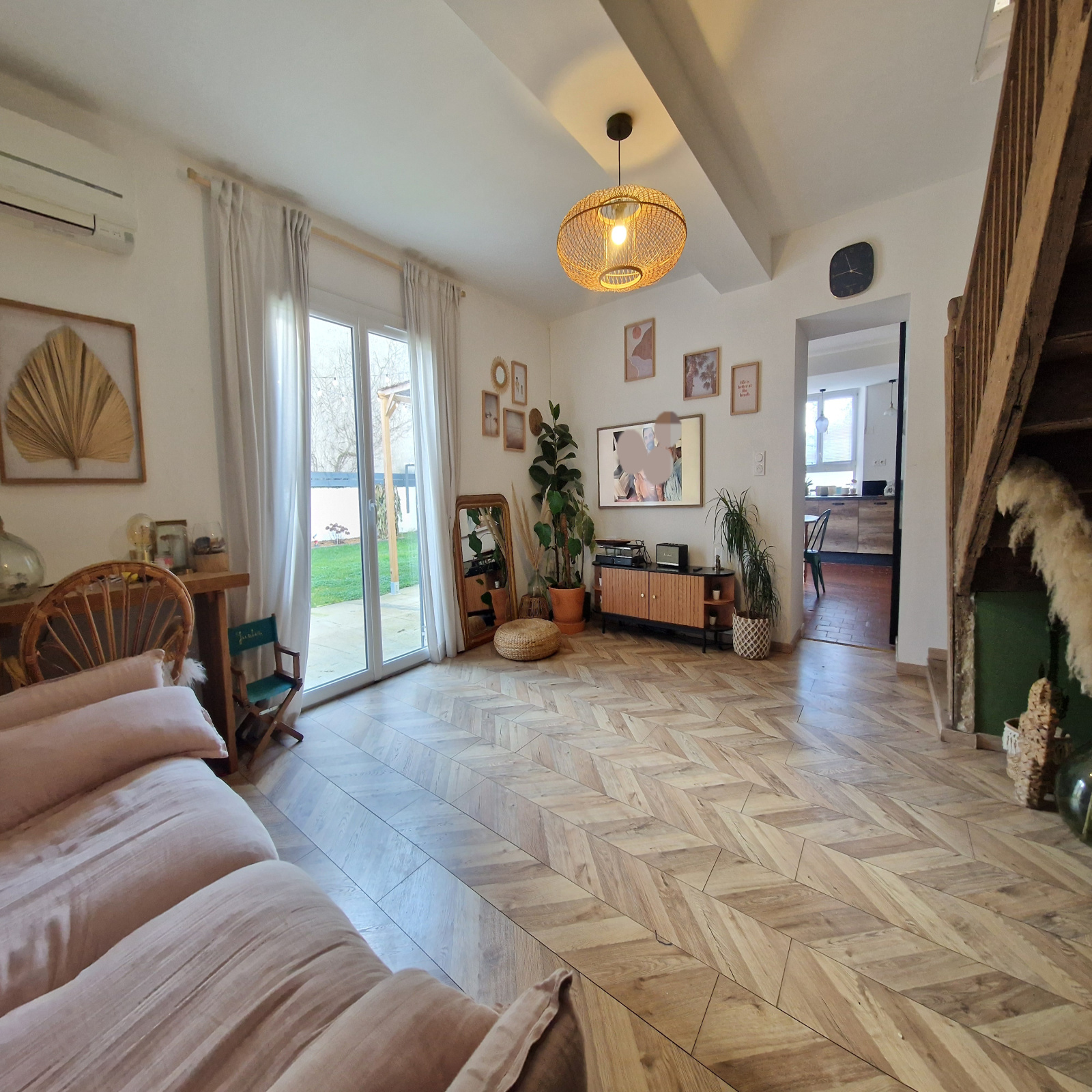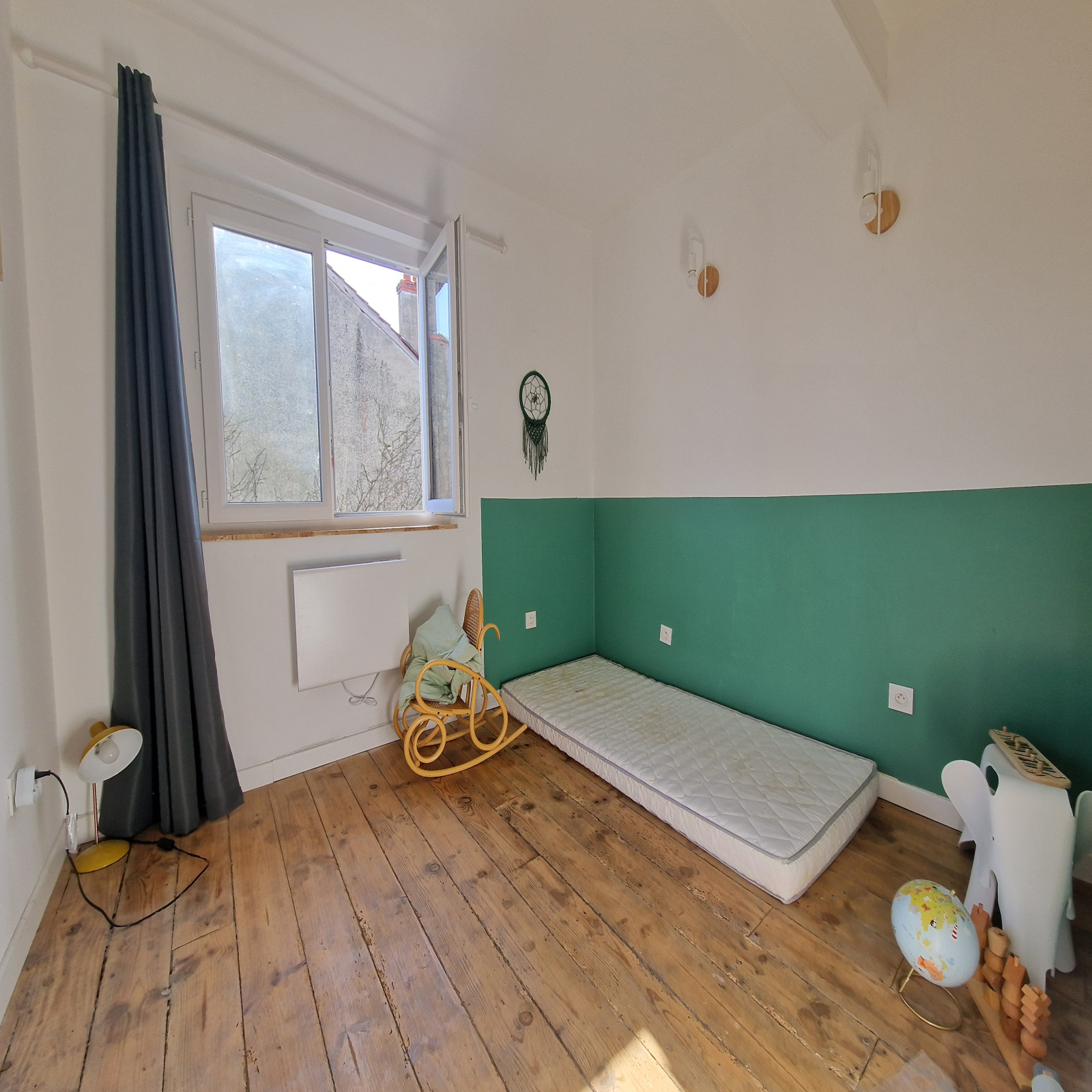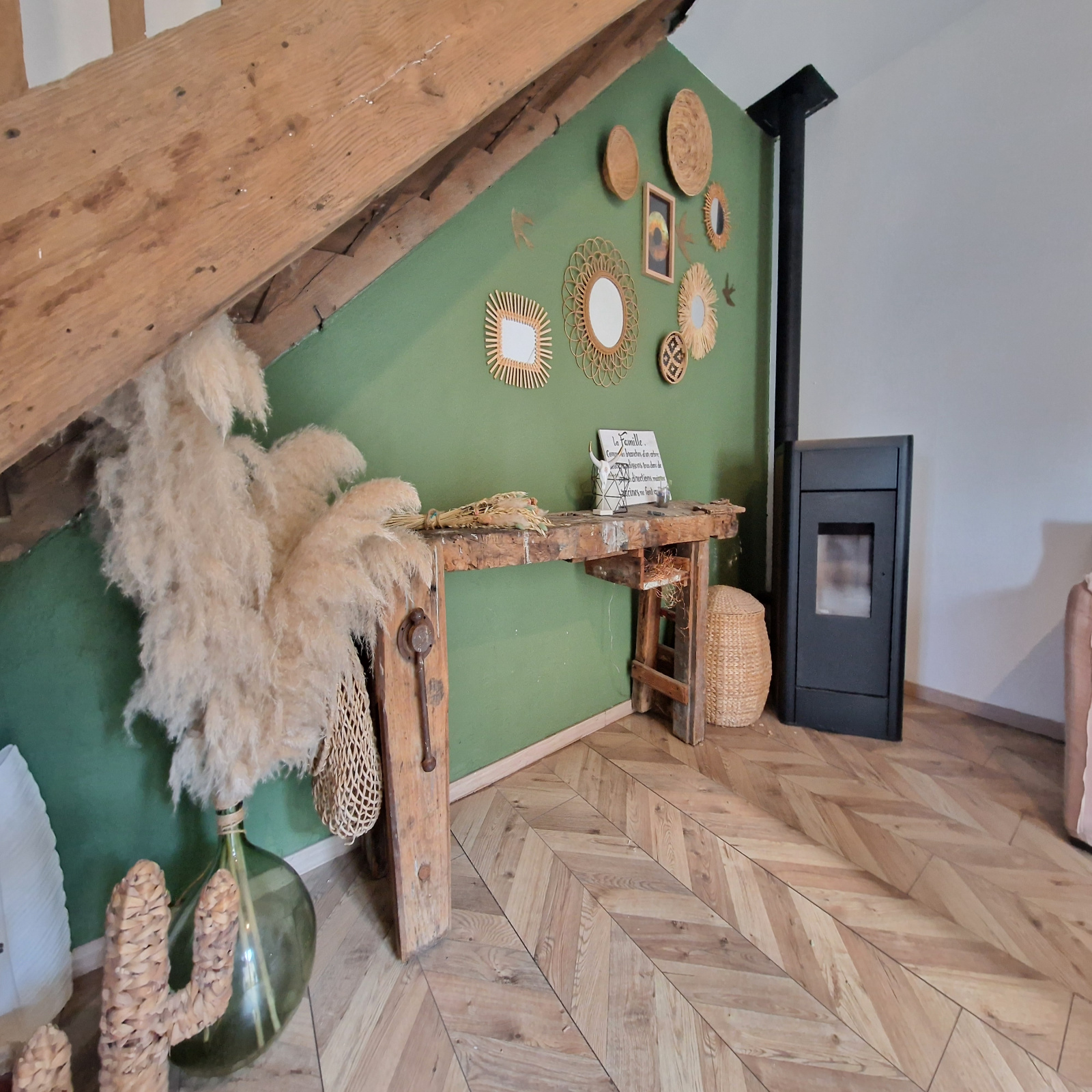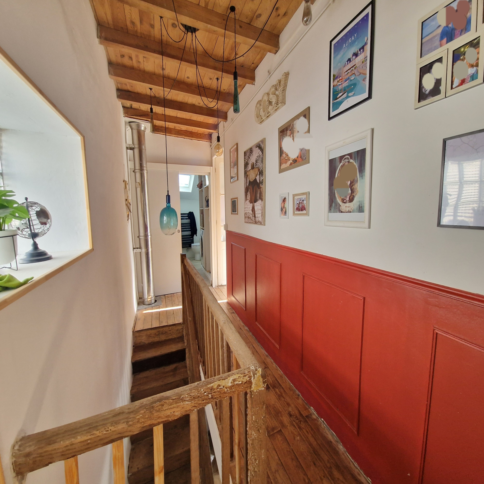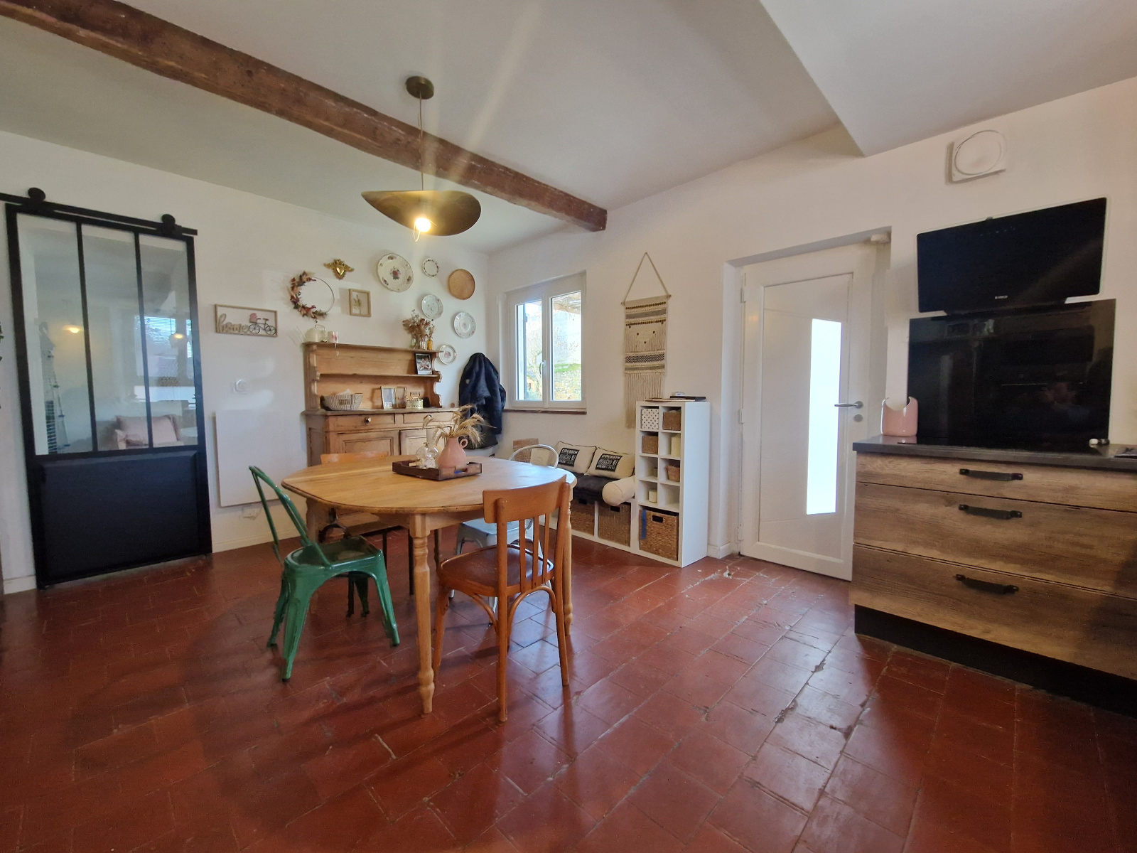 Maison de 90 m2 comprenant en rez de chaussée, une cuisine salle à manger et un salon avec poêle à grannulés. A l'étage, un couloir dessert deux chambres, un bureau, et une salle d'eau avec WC.