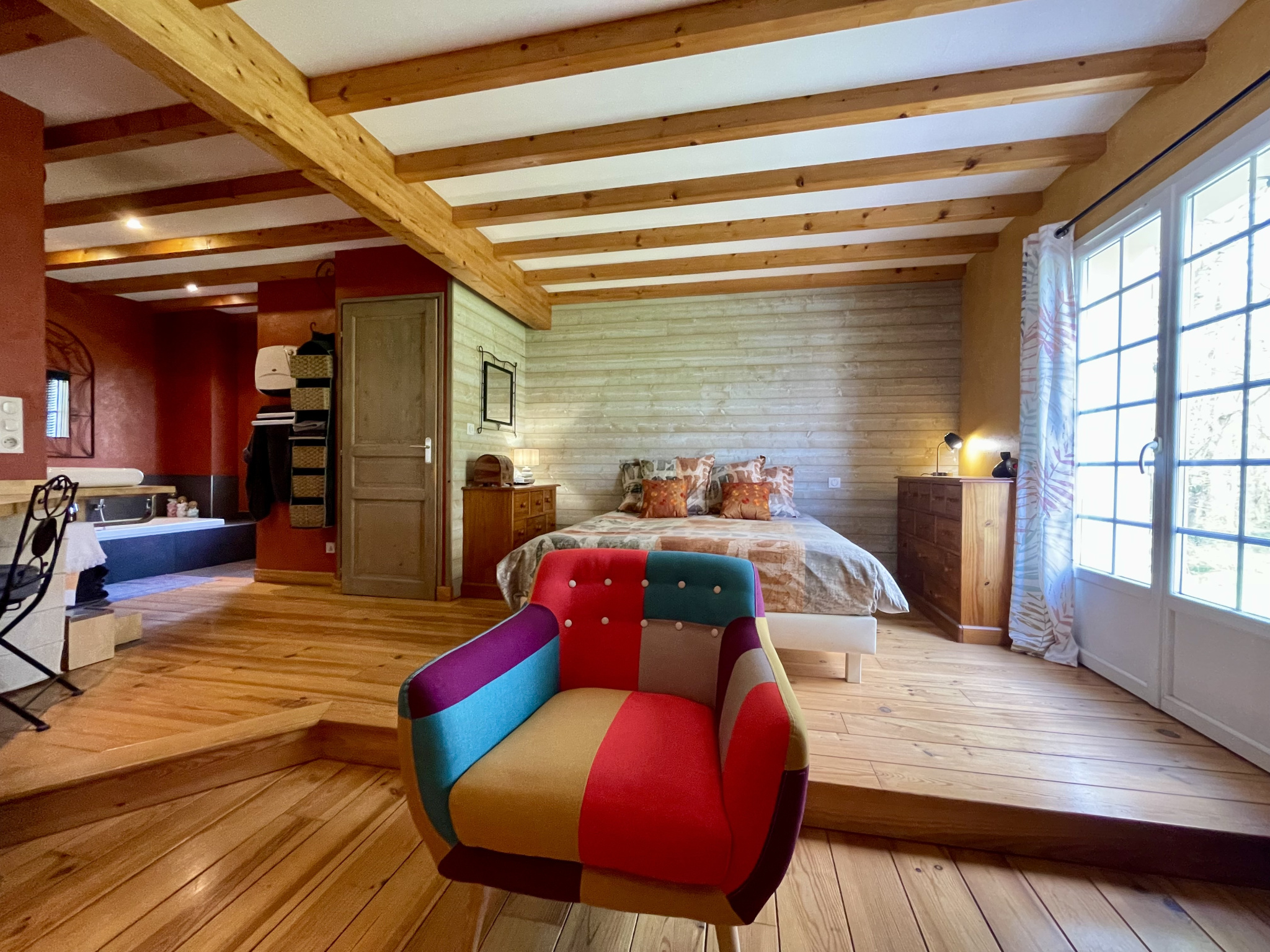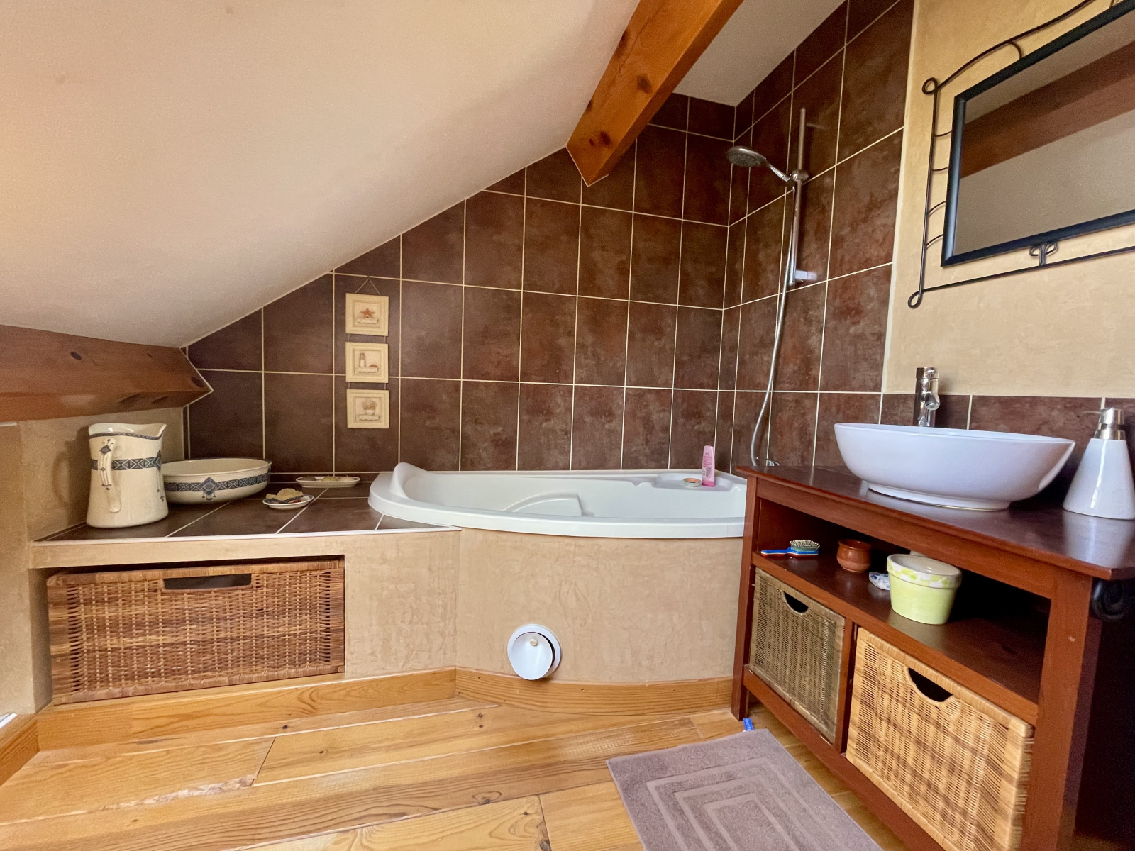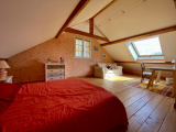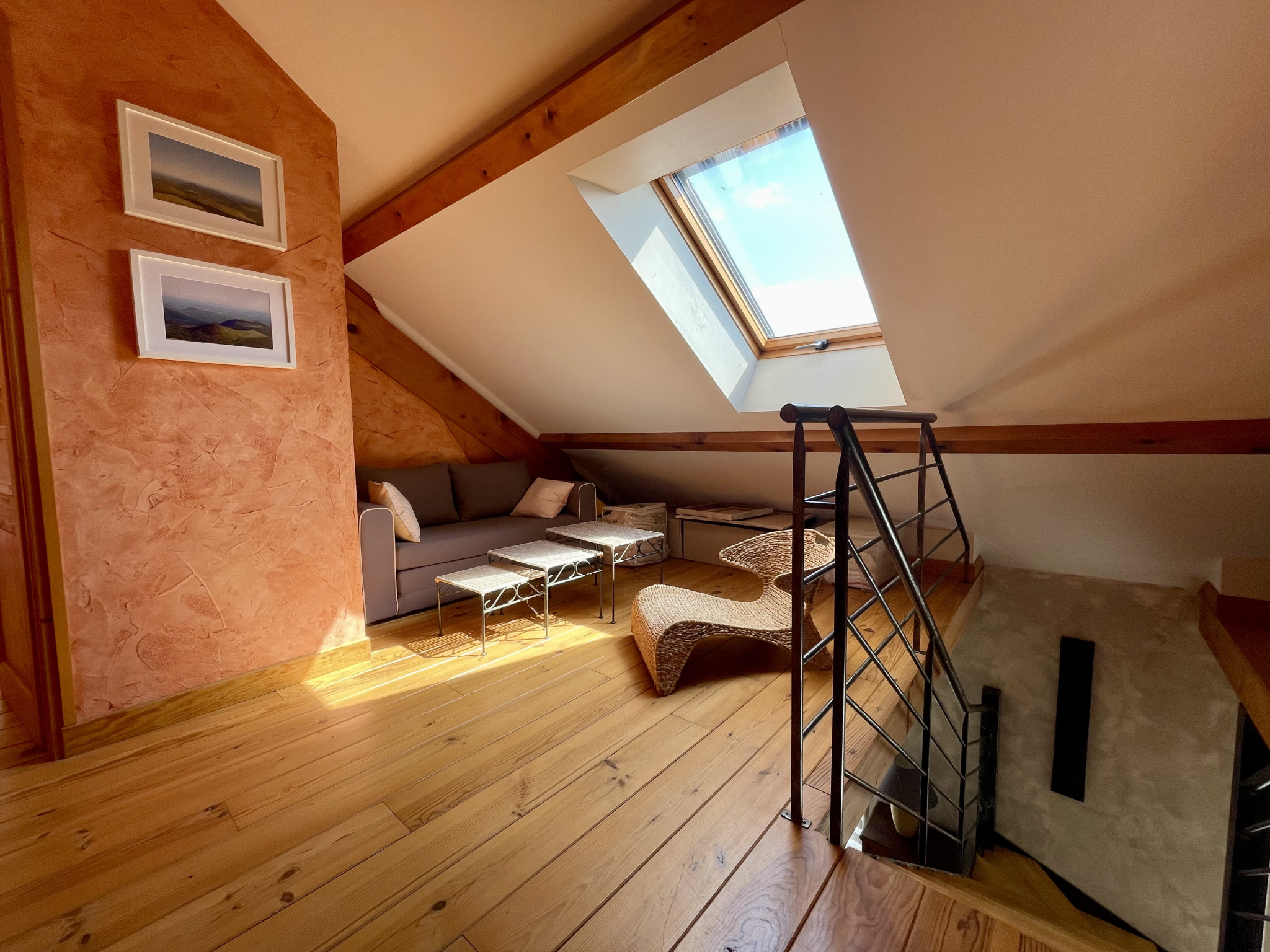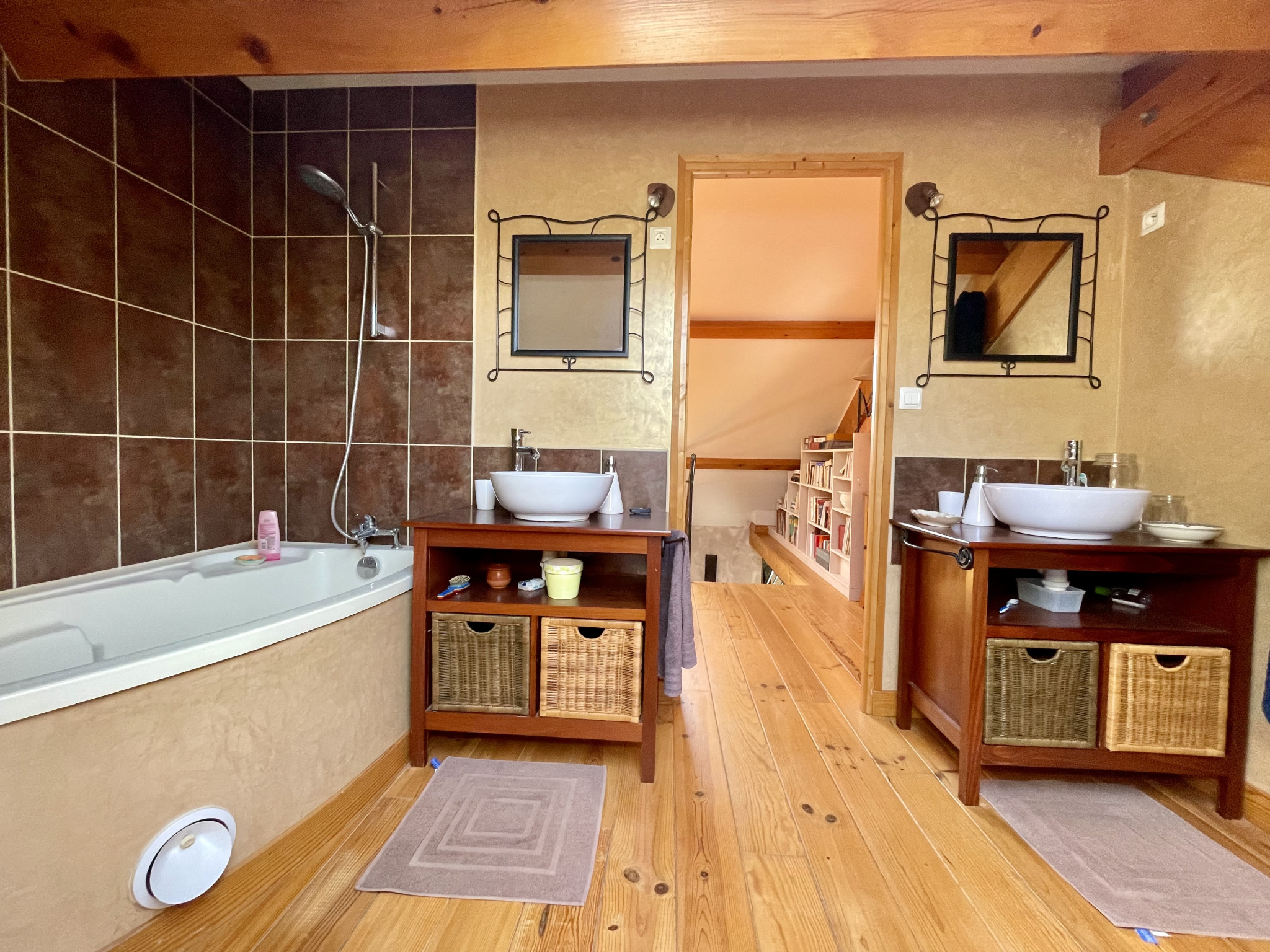 L'étage offre un pallier aménagé en salon, une salle de bain avec double vasque, baignoire et WC et 2 chambres.