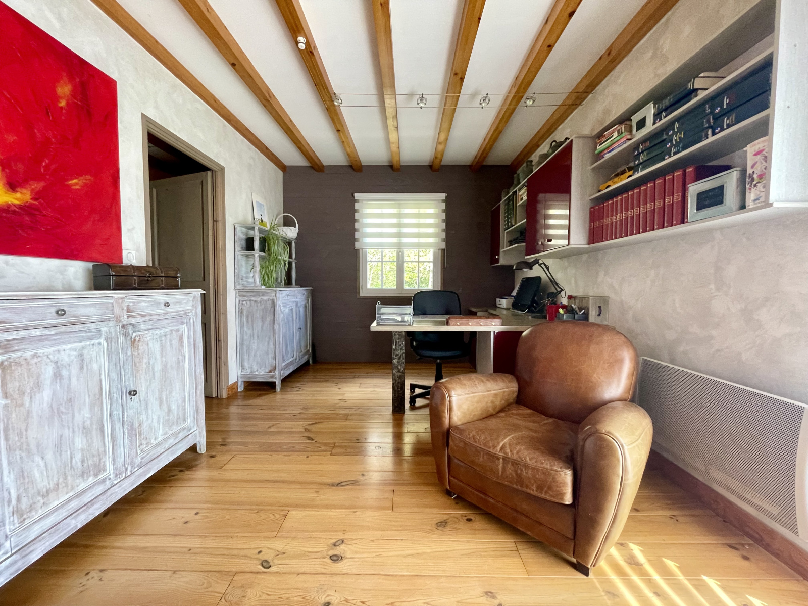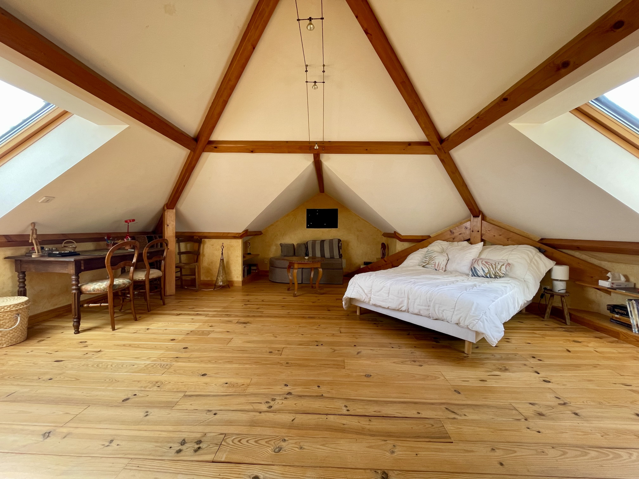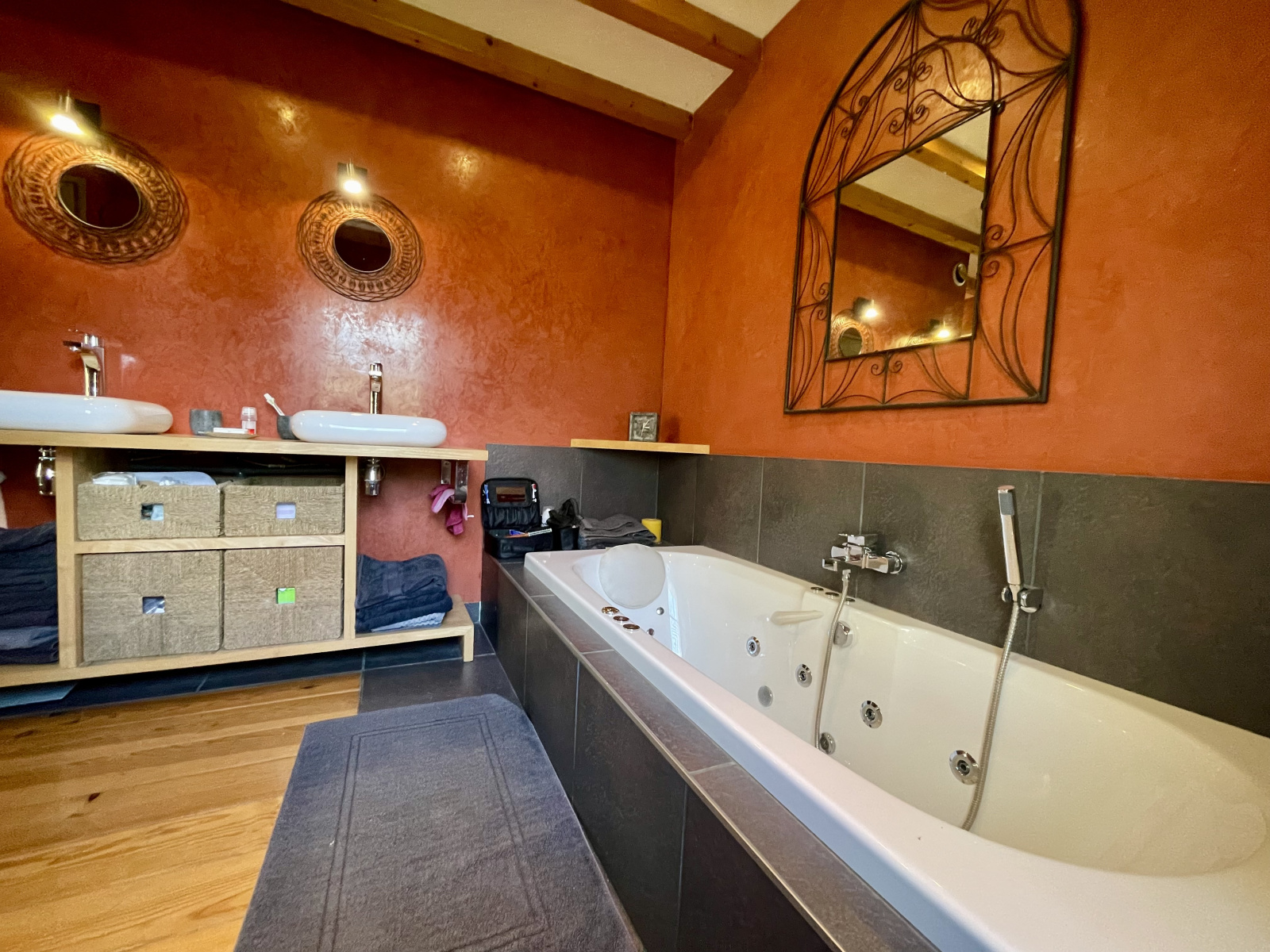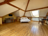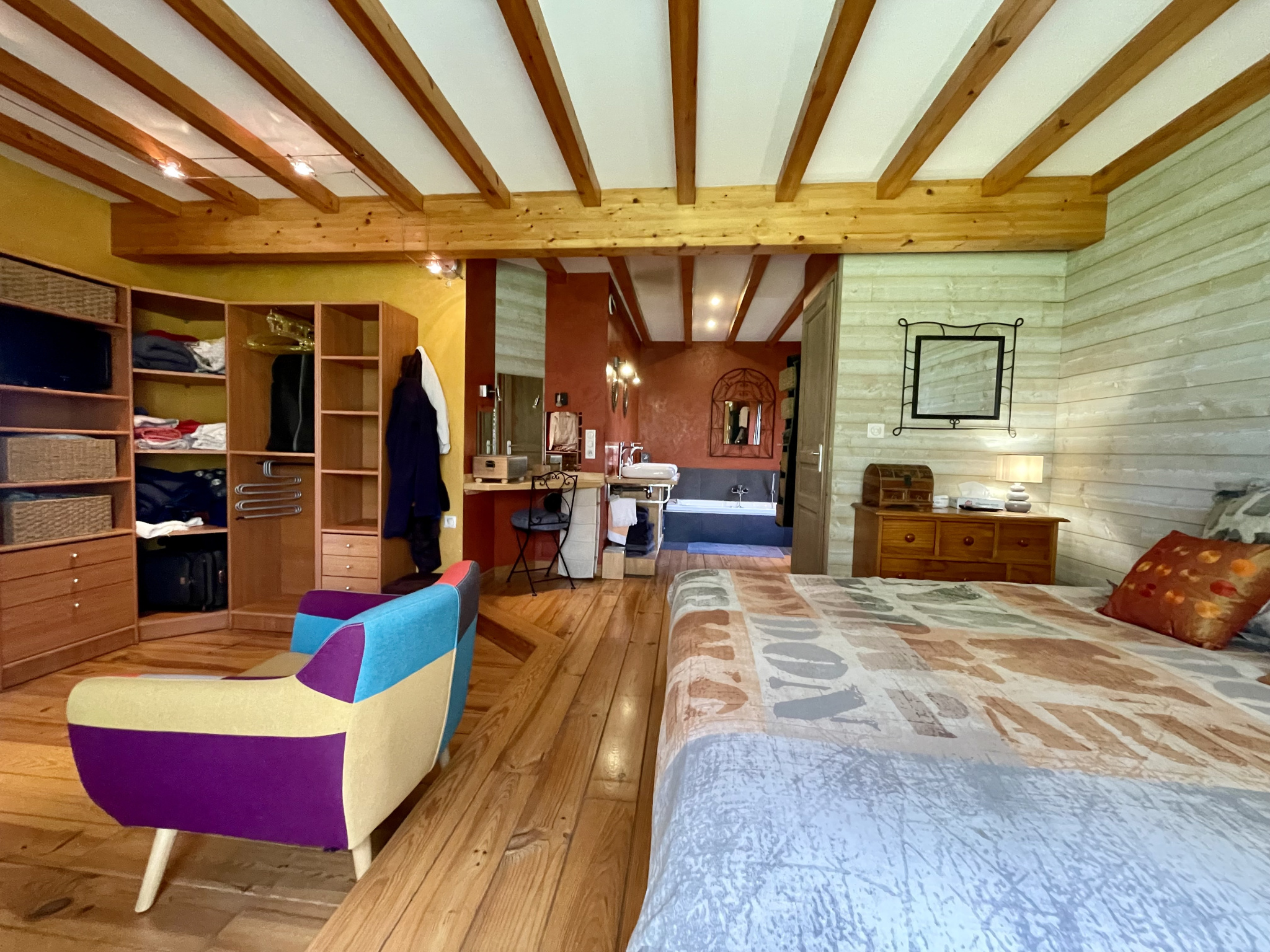 L'étage offre un pallier aménagé en salon, une salle de bain avec double vasque, baignoire et WC et 2 chambres.