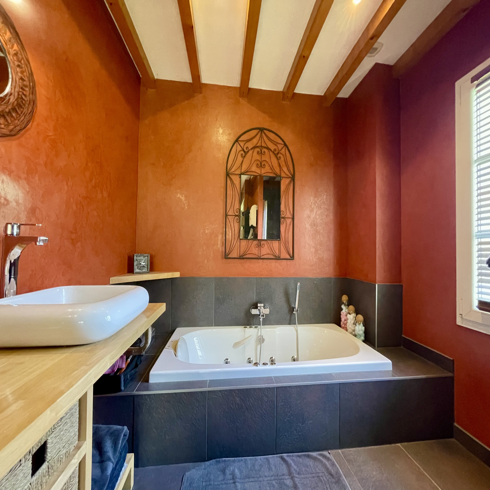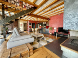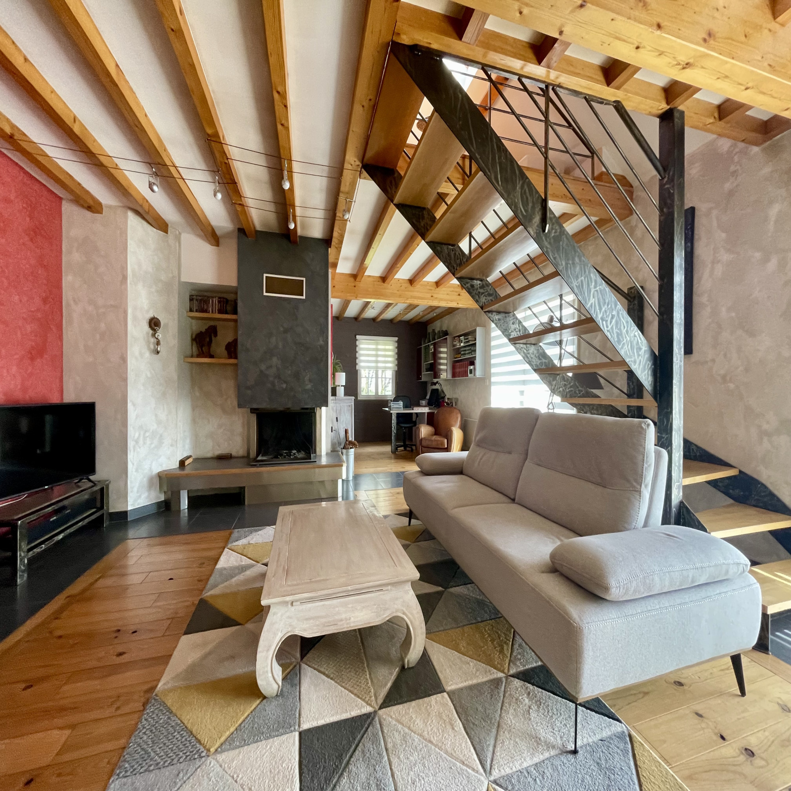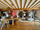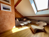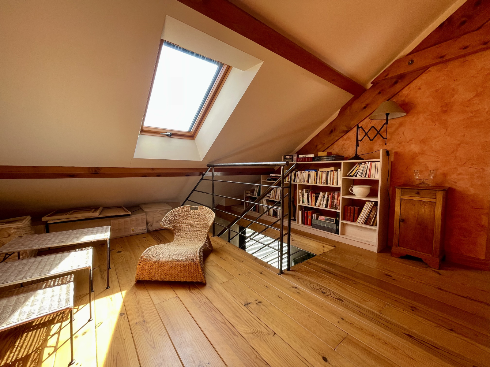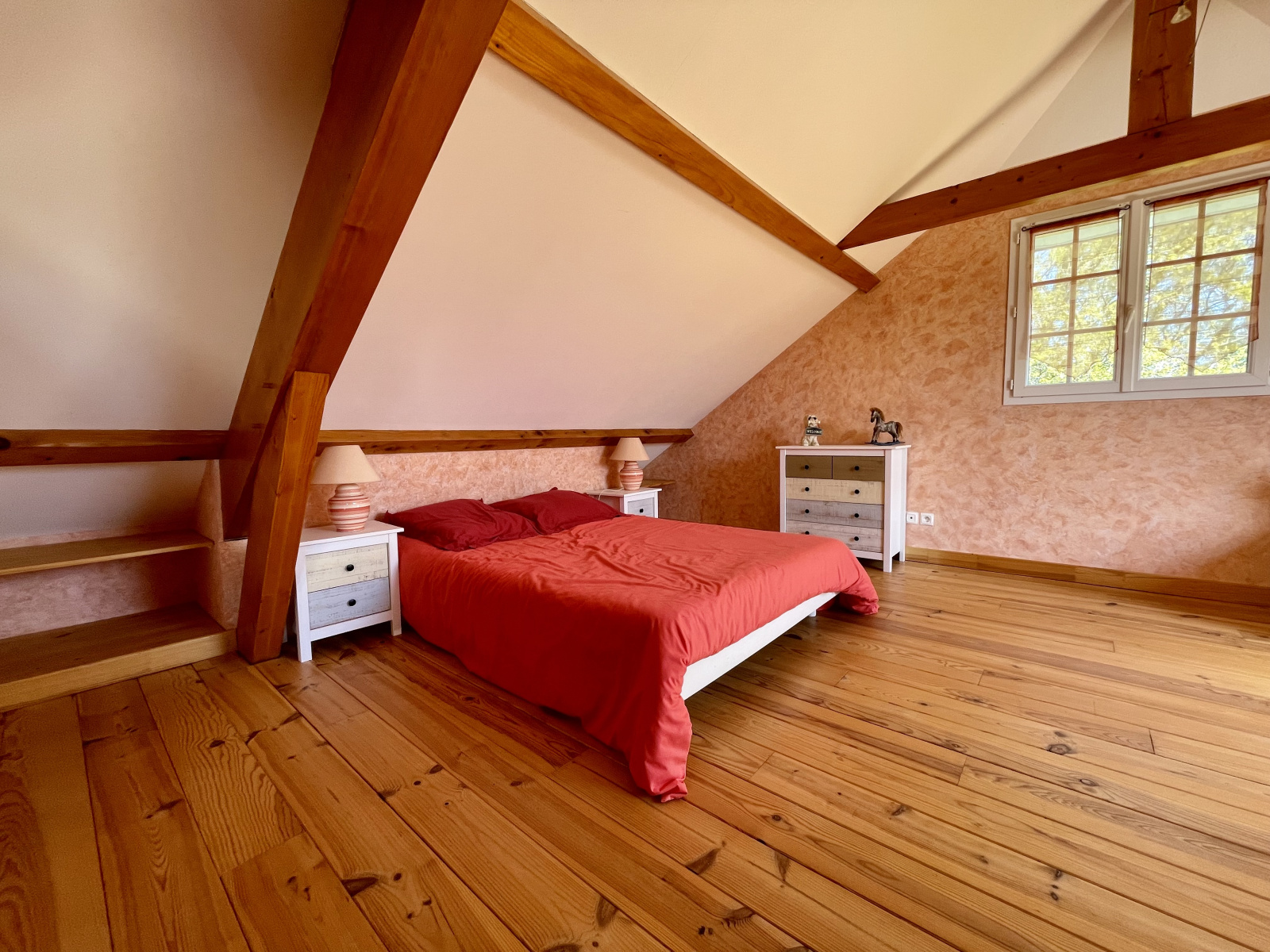 L'étage offre un pallier aménagé en salon, une salle de bain avec double vasque, baignoire et WC et 2 chambres.