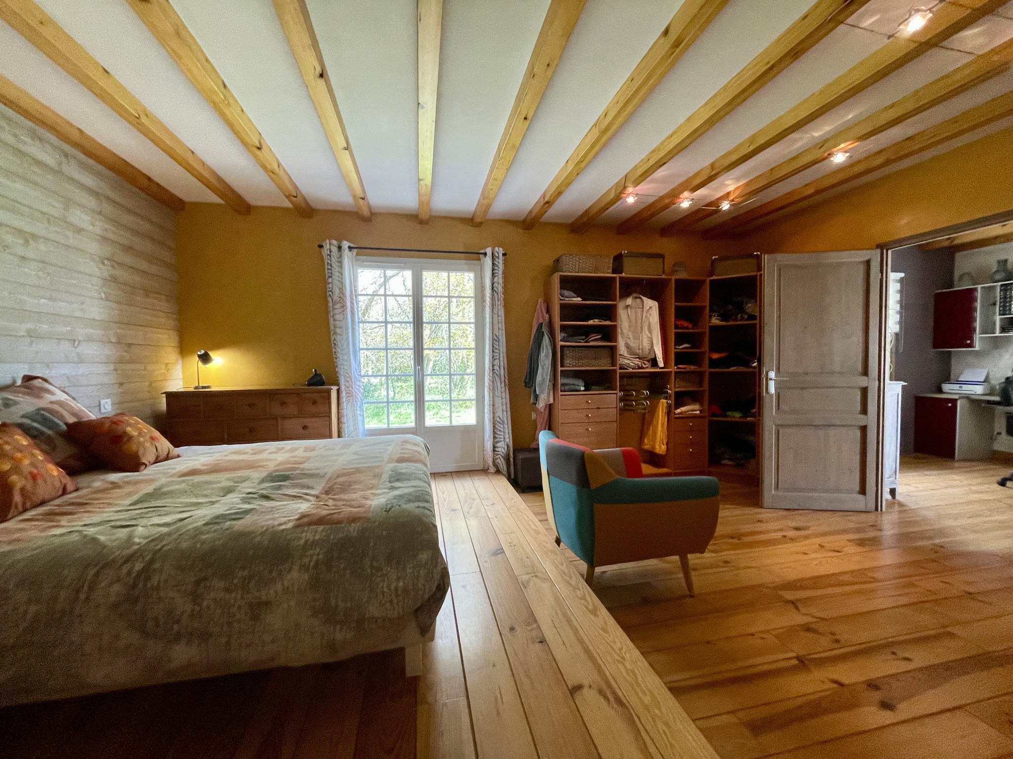 Le rez-de-chaussée comprend un grand salon-séjour de 41,41 m2, une cuisine de 10,30 m2, un cellier de 8,83 m2, un WC, un bureau de 10,26 m2 et une belle chambre de 28,75 m2 avec dressing, salle de bain avec baignoire et douche et WC.